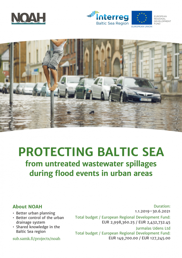 NOAH – Baltijas jūras aizsardzība no neattīrītu notekūdeņu ieplūdes pilsētu teritorijās plūdu laikā Eiropas Reģionālās attīstības fonda līdzfinansētais projekts NOAH ir viens no INTERREG Baltijas jūras reģiona transnacionālās sadarbības programmas projektiem. Projekta mērķis ir stiprināt integrētu attīstību un sadarbību vieglāk pieejamam un ilgtspējīgākam Baltijas jūras reģionam, īstenojot projektus, kas risina kopīgas galvenās problēmas. Projekts tiks realizēts sadarbībā ar RTU speciālistiem. Projekts apvieno 18 partnerus, tā vadošais partneris ir Tallinas Tehnoloģiju universitāte. Programmas līdzfinansējuma likme Latvijas projektu partneriem ir 85% no projekta attiecināmajiem izdevumiem. Nacionālais līdzfinansējums 15% apmērā jānodrošina projektu partneriem. Piedaloties NOAH projektā, SIA „Jūrmalas ūdens” izvirza sekojošus darba uzdevumus ar attiecīgiem ieguvumiem: