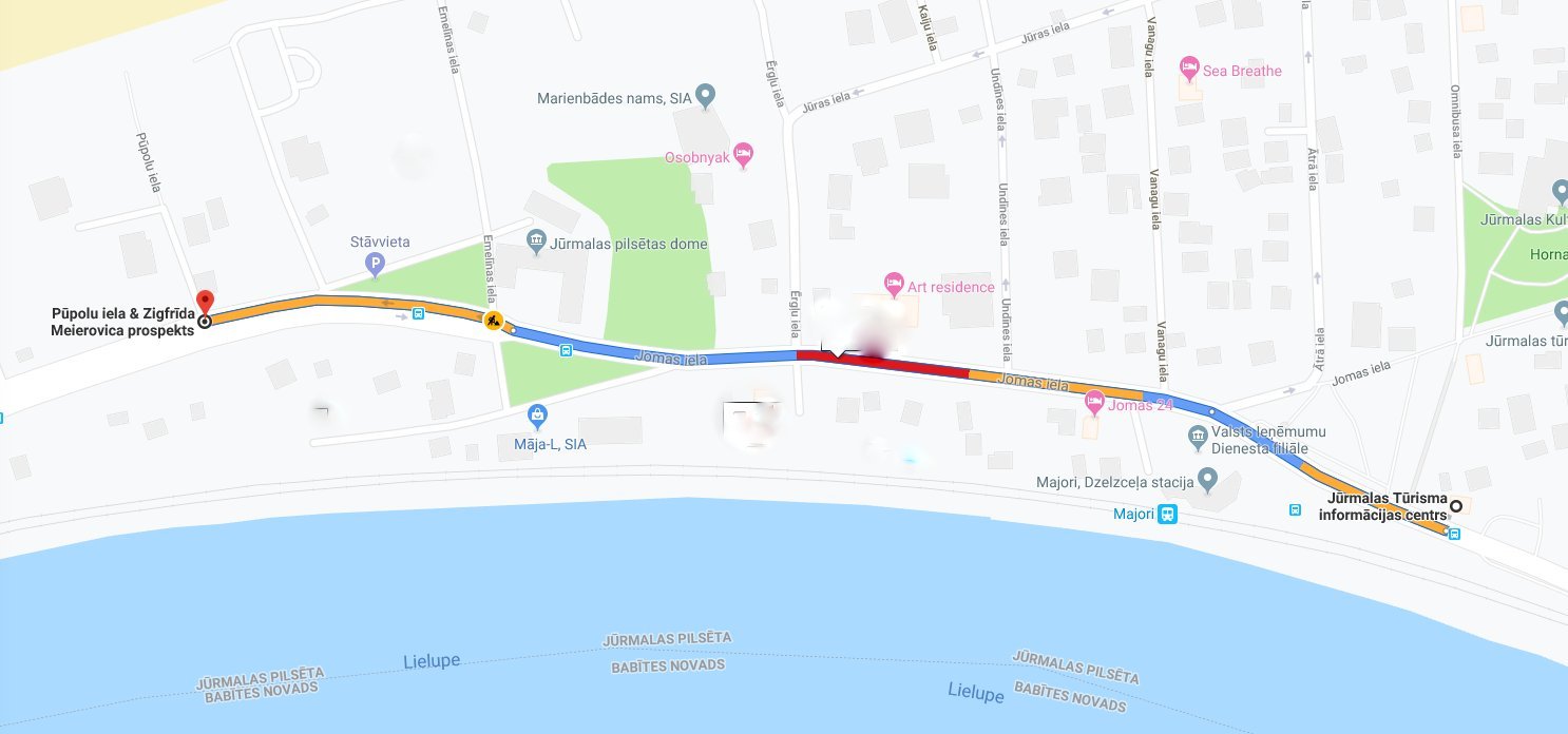 Remontdarbi Eduarda Veidenbauma un Eglaines ielu krustojumā Eduarda Veidenbauma un...Remontdarbi Eduarda Veidenbauma un Eglaines ielu krustojumā Eduarda Veidenbauma un Eglaines ielu krustojumā nopietnas avārijas remontdarbu dēļ, būs apgrūtināta piekļuve pie īpašumiem Eduarda Veidenbauma ielā no Eglaines ielas uz dzelzceļa pusi. Tāpat remontdarbu laikā slēgts Eduarda Veidenbauma ielas posms no Eglaines ielas līdz Medņu ielai. Lūdzam iedzīvotājus nekavējoties ziņot SIA “Jūrmalas Ūdens” par kanalizācijas vai dzeramā ūdens noplūdi Slokas rajonā, zvanot uz bezmaksas tālruni 80205006 vai +371 67733188. SIA “Jūrmalas ūdens” atvainojas par sagādātajām neērtībām un cer uz Jūsu sapratni! 31.05. - 08.06.